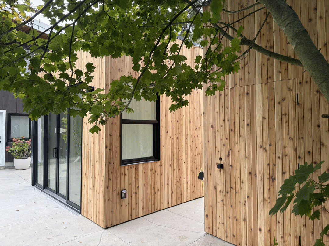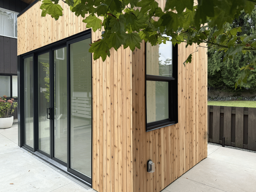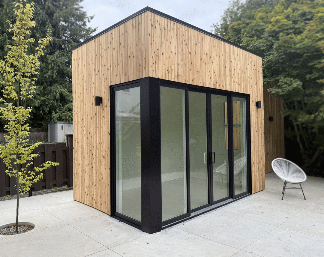 This North Van Workshop & Shed is a premium ASUNTO 8′ x 13′ Backyard Studio extra-height with flat roof build package. It features an extra 2′ of height all around 8′ high sliding glass doors and windows. The interior walls and ceiling is drywalled with track lighting for optimal directional work/task lighting. The exterior has 4″ Cedar channel siding. Next to the studio is a 5′ x 10′ storage shed with matching finishing and the surrounding yard has multiple concrete patios and walkways.